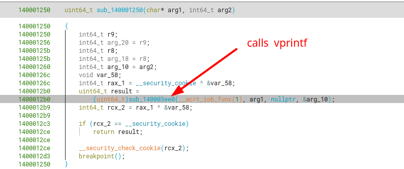 The first function we managed to identify is an indirect call to vfprintf under sub_140001250, which in turns calls sub_140003ee0 which then calls vfprintf.