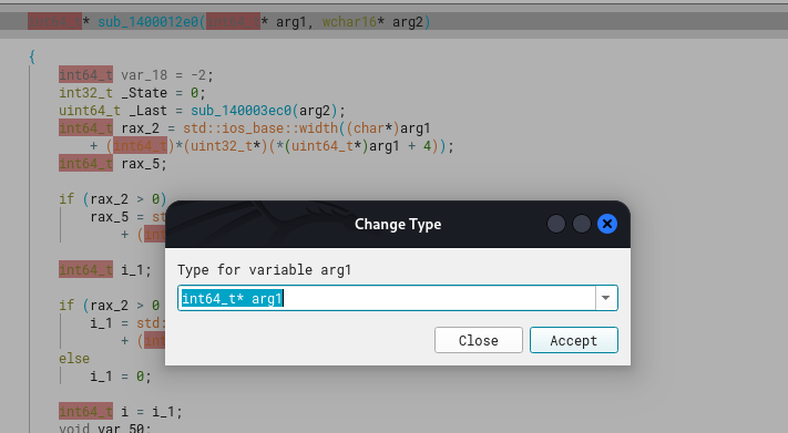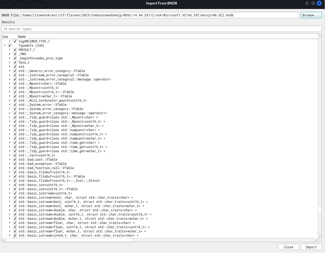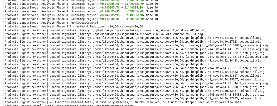 Still, by the end of this write-up I can already tell that there was little success with the function signatures I had, and had to manually identify most standard C++ functions from this binary. Although class definitions were (and always are) really useful.