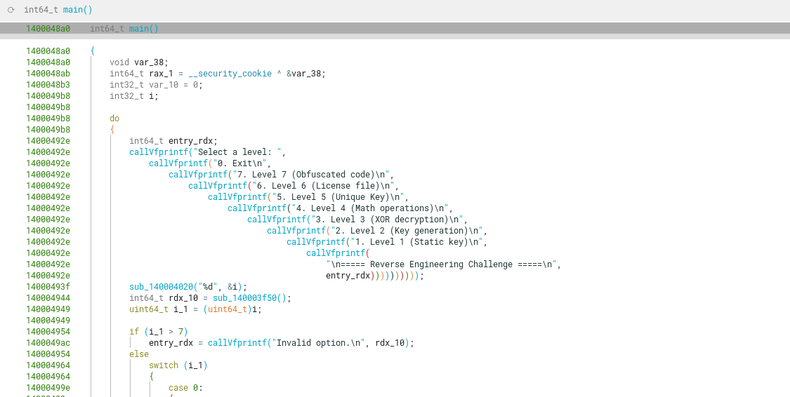 Having a first look at the function level_5, we quickly spot that it measures execution time between a for loop of 1.000.000 integer ADD and DIV operations. This is a known anti-debugging technique used to detect if a user is attached to the program with a debugger (as the time to execute inside a measured block could be longer when stopping with breakpoints).