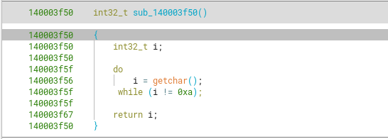 Looking at the disassembled view of it, we can confirm the previous hypothesis. It’s a “getChar” kind of function that keeps accepting input until reaching a newline, returning it back as uint32_t instead of a char