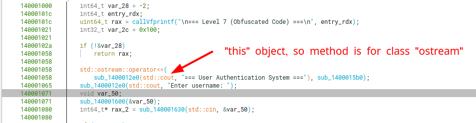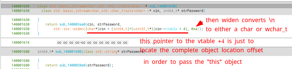 An extra bit of info in case you were wondering why there are functions that reference the start of std::cin, yet add an offset to the vtable member for this class. This happens because what we originally think is a pointer to the start of std::cin (of class std::basic_istream) is in fact just a pointer to part of the object.