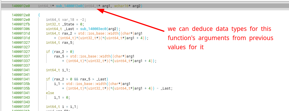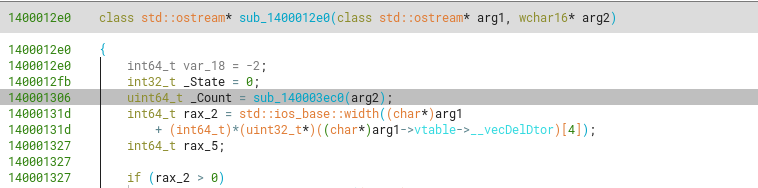 Another function we can recognize partly, the reading of input from stdin (as a char array) to a std::basic_string<char>. We can correctly identify it’s argument types, and that it corresponds to a class method, as we know that class methods contain as its first argument (RCX) a pointer to the this object. However, we won’t attempt to pinpoint the exact name of the method, as long as we know what it does regarding the inputs and outputs (and side effects to them).