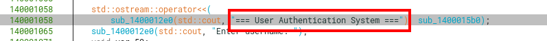 After looking at the stack variables size’s for the username and password (0x20), we can make an educated guess that they’re most likely a std::string (we can discard that it would be a std::wstring from previous function signature analysis).