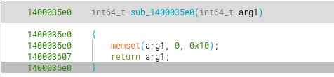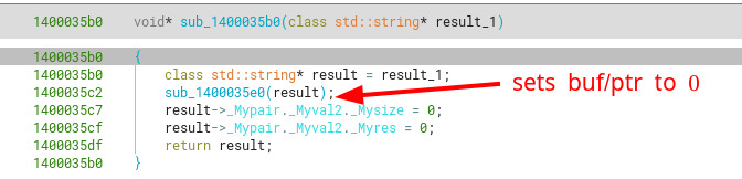 Further going into the first function, we see that it calls sub_1400035b0, which sets all members of this string to null bytes.