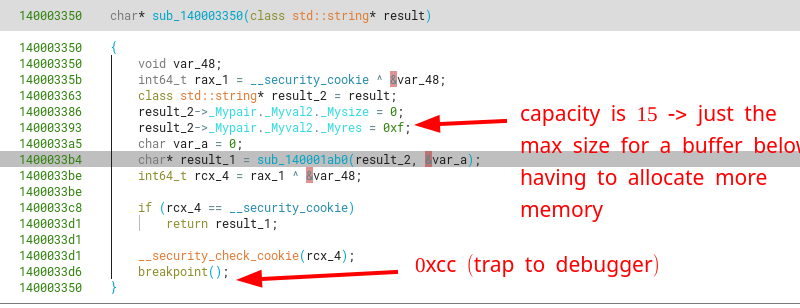 Going into the next function call, we see that sub_140003350 sets the members for this “cleared” string object to the default string values. That is, having an initial capacity of 15 chars, a size of 0 (because no real chars are written yet), and a buffer with the first char being a null byte (which corresponds to a 0-length string)
