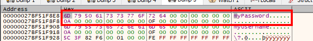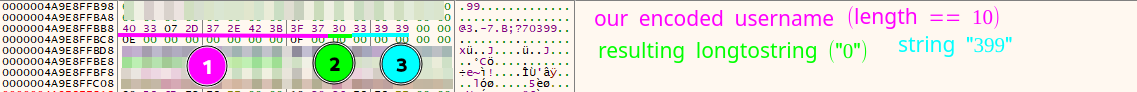 Debugging the program with a dummy username and password (both 10 or 0xa bytes in length) shows us the strings are in fact less than 16 bytes in size, and as so, their initial member is completely used as a buffer instead of a pointer to a bigger buffer.