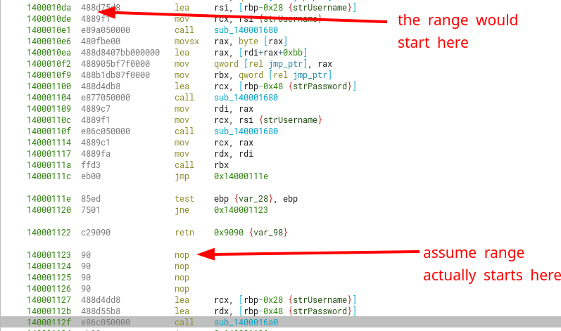 This makes us think that the ranges that we can jump into, with jump_ptr and our first char, are limited by our username constraints. If we assume the username can be supplied only with printable characters (bytes between 0x20-0x7e), then the addresses to jump into goes between 0x1400010db-0x140001139. However, if we further assume that we shouldn’t jump to previously executed instructions (because it will be meaningless or cause a crash), then we can actually start from 0x140001123 (nop instruction), which comes.