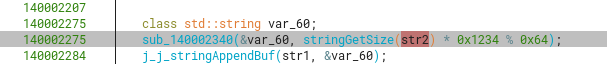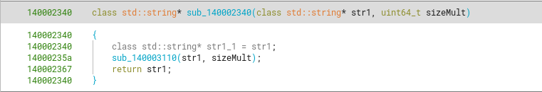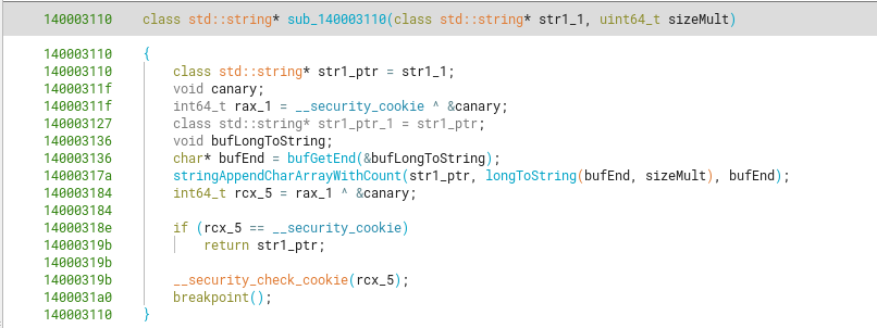 Going deeper into the callgraph, the sub_140003110 function shows us it’s appending (or assigning) the values from a string version representation of arg2 (sizeMult) into this new string (arg1).