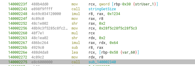Afterward, an interesting calculation is made with the length of the username. This is shown in the decompiled view as a simple operation, however it’s more complex looking at the individual x86 instructions, although the results using both expressions are the same.