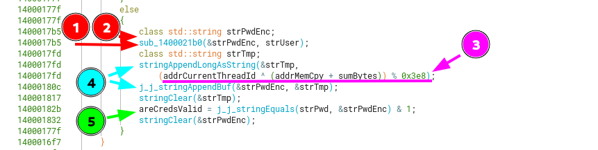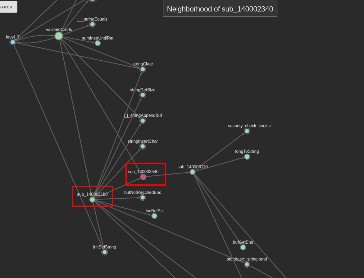 Looking at the second relevant call inside the validateCreds function (sub_140002340), which does a calculation with 2 DLL offsets and the sum of bytes for level_7, we can see that it’s a previously called function inside sub_1400021b0. That is, part of its code is also used inside sub_1400021b0.
