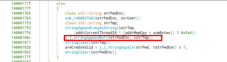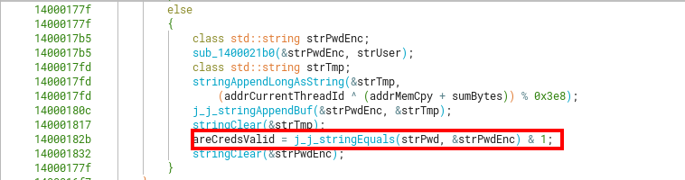 Other steps in validateCreds involve erasing or clearing the previously initialized strings, however a much more interesting part is the comparison between the original password we input, with the now encoded username + long.