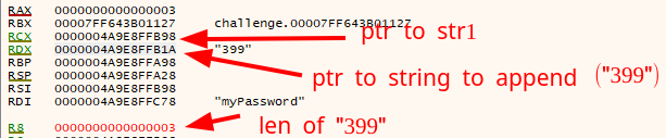 Through debugging just before the call to our defined function stringAppendCharArrayWithCount, we know its argument values are in order the next ones.