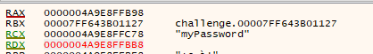 The RAX register contains the first char to our username (myUsername).