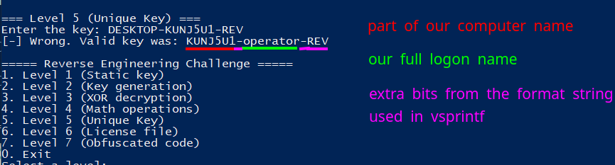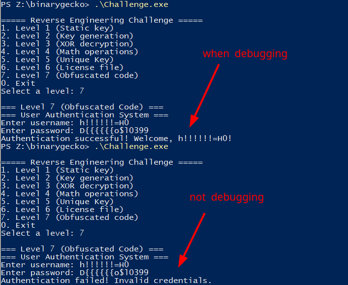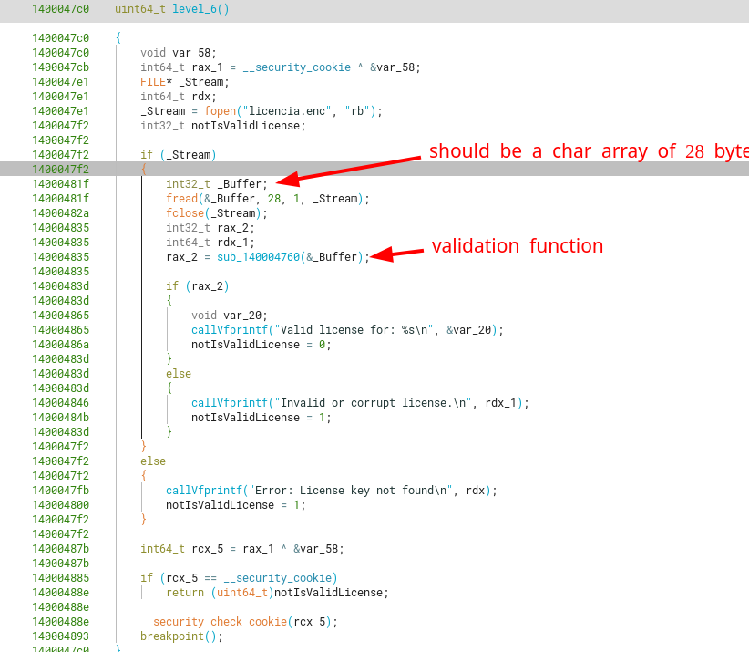 Something I missed when originally retrieving the sumBytes constant after calculation inside a debugger, is that software breakpoints were being taken into account for the sum of bytes. As I planted some breakpoints between the start of level_7 and its first 0x1000 bytes, I got an incorrect value that got dragged into the calculations for the final encoded username, as software breakpoints are created inserting the instruction int3 (byte c3) into code. This can be fixed removing breakpoints in the areas of interest (from level_7 to its first 0x1000 bytes or until finding a ret), or just using plain ol’ hardware breakpoints, which are handled through registers and the CPU instead of inserting instructions at runtime.
