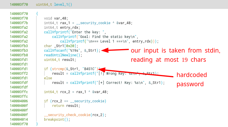 Starting with a simple view of the level 1 function, we can see that this level contains a hardcoded password (B4S1C) that is checked against our 19-byte string input.