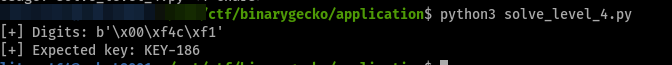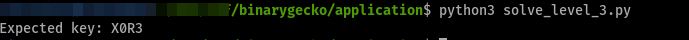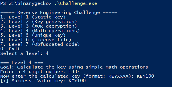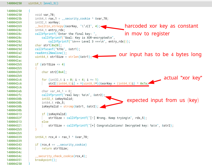 This level consists of decrypting a 4-byte hardcoded key using a XOR operation, along with a 1-byte XOR key (0x7a). The program first asks us for the expected key, which has to be at most 4-bytes long. Then it decrypts the hardcoded key with a XOR operation, and compares it with what we originally gave it. They should be the exact same input.