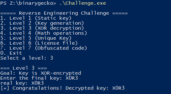 Creating a small script in Python gives us the decrypted key X0R3, which we can then test with the program.