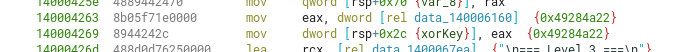 There’s also a function that uses the address of the level_7() function, that sums all its bytes until finding the first ret instruction (or traversing the first 0x1000 bytes). As this function won’t ever change (unless you modify an instruction in runtime), its return value will be always the same.