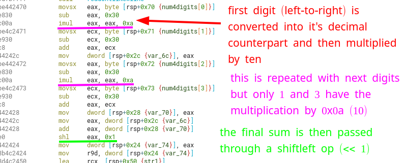 After doing a sort of asciiToIntfor each digit (sub eax, 0x30), only digits 1 and 3 are multiplied by 10 (0x0a) before adding them into the sum.