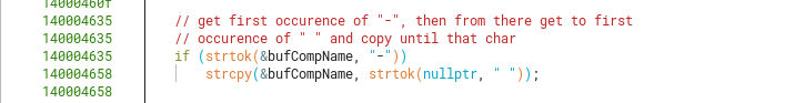 The next steps in this function are to find the position of the substring “-” inside our computer name, using the well-known C library function strtok.
