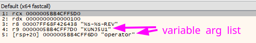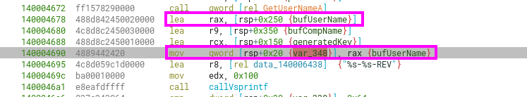 Looking at the arguments before the call to sub_140004490 (that eventually calls vsprintf with a similar arg order) in runtime, we can see that the username is included as part of the vaList:
