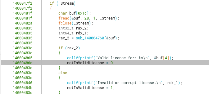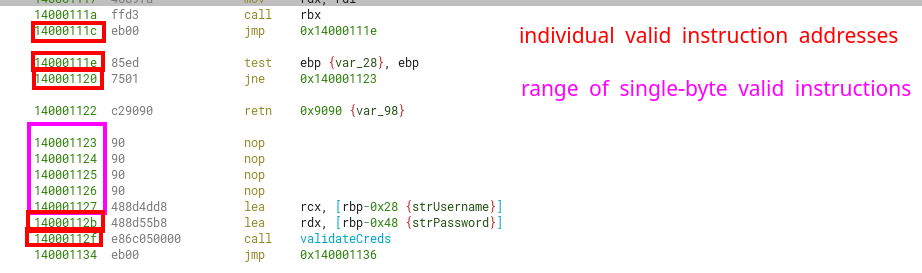 We can also include as whitelisted address 0x14000111c, 0x14000111e, 0x140001120, 0x14000112b and 0x14000112f. These are the starts of valid instructions that won’t make the program crash before reaching the credential validation function.