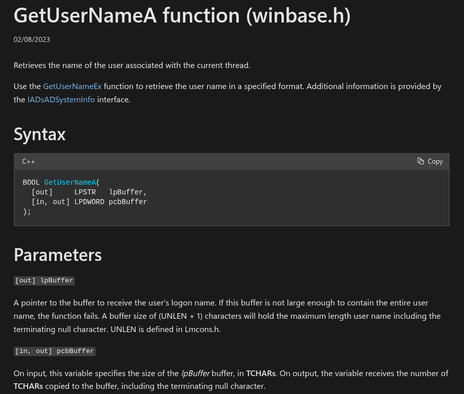 https://learn.microsoft.com/en-us/windows/win32/api/winbase/nf-winbase-getusernamea