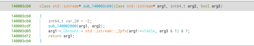Following a similar approach with function sub_140001630, we can see its arguments are stdin as a std::basic_istream<char>, and another std::basic_string<char>. This function eventually calls sub_140003aa0, which does the heavy lifting of correctly reading chars from std::cin.
