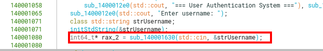 What is relevant here is that the read from std::cin will impose no limits on its input size (besides the limits imposed by the std::string class, of course). So the username and password could effectively be of any size in this part. More on how the program validates those inputs will be shown later.