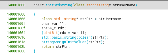 So basically sub_140001600 “initializes” a std::string object by clearing all it’s values (setting them to 0), and then setting the string members with “default” values. So a good name for this function is initStdString.