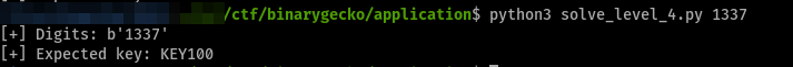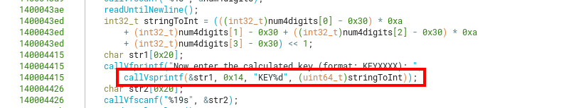 As the method for parsing the input is using the format string %4s, any 4-char sequence can be inputted and the same math operations will be performed on them. We can try our keygen with the input l33t, giving us the expected key KEY1402.