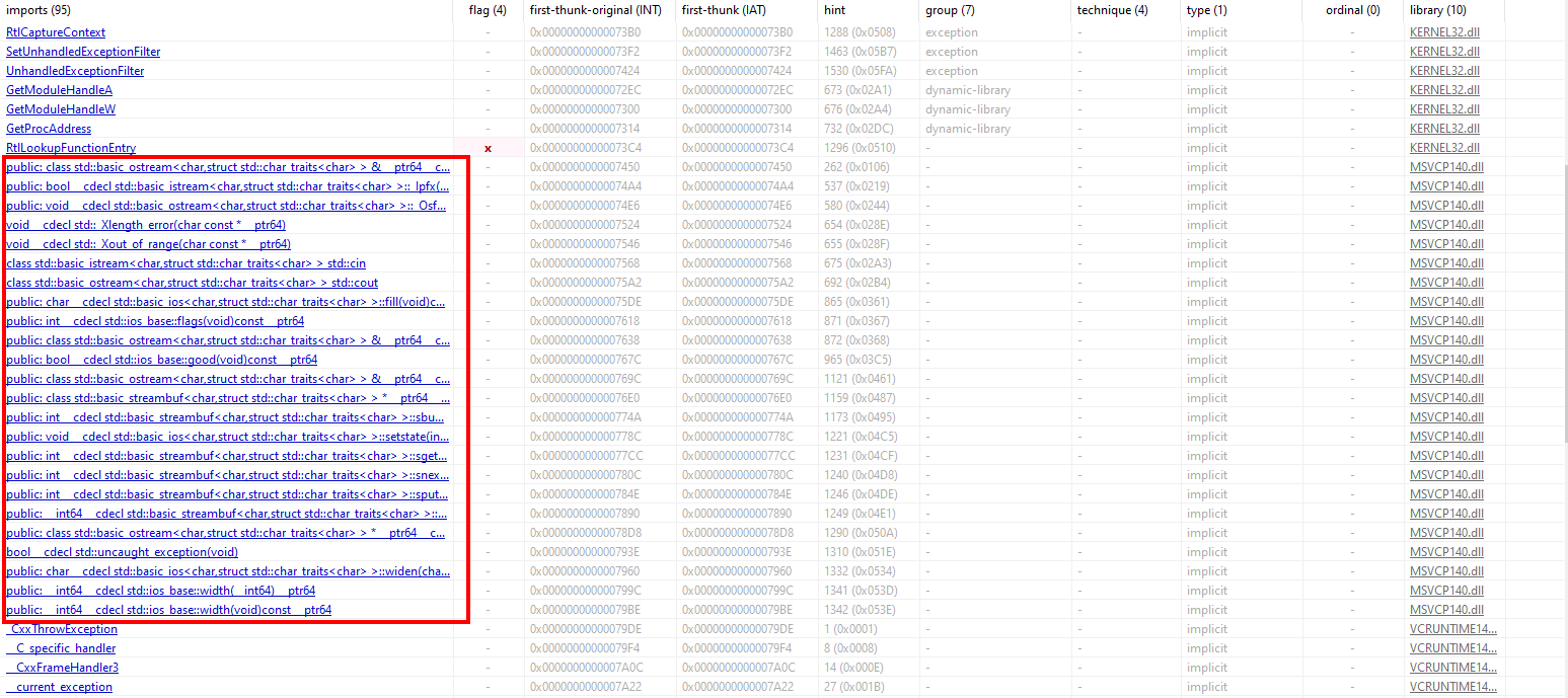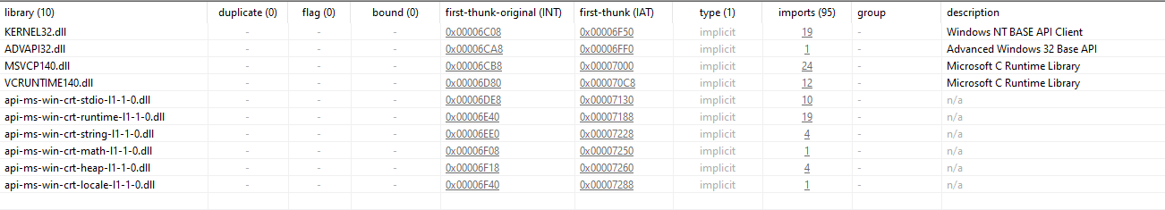 From the imports for this program, we quickly see that it’s a C++ binary. Although we can’t find the ID of its Visual Studio version used to compile it with.