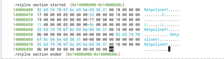 Looking at the code sections, one that initially standed out was the section .retplne, as its flags show it’s only for read, but not execute nor write.