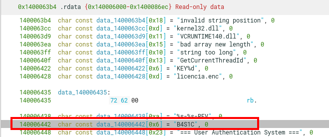 We can easily confirm the match for the hardcoded key B4S1C on runtime.