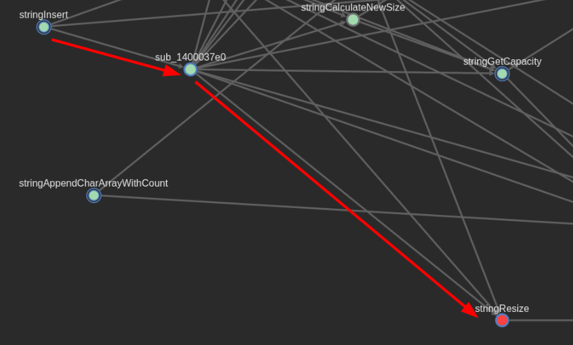 Besides deducing that this is how the program reads from std::cin (stdin), it’s also interesting because the function that I renamed as stringInsertChar has a very deep callgraph, which will eventually call stringInsert (another key function I encountered).
