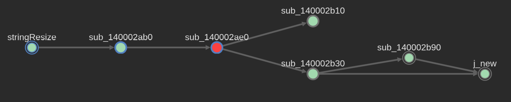 stringInsert will then eventually call stringResize, and as you may guess, it relates to how a string updates its size and capacity members, along with an eventual call to the new operator in order to allocate memory when a string goes over the 16 byte length for its buffer member. I’ll talk more about the std::string definition and its members later.
